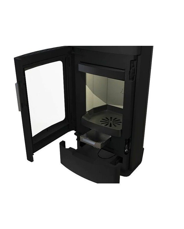 Die große Sichtscheibe mit Scheibenspülung bietet einen freien Blick auf das Flammenspiel, während das integrierte Holzfach praktisches Nachlegen und stilvolle Lagerung ermöglicht. Die robuste Bauweise mit Gussrost, feuerfestem Keramikglas und hitzebeständiger Lackierung (bis 650 °C) sorgt für Langlebigkeit und Sicherheit.